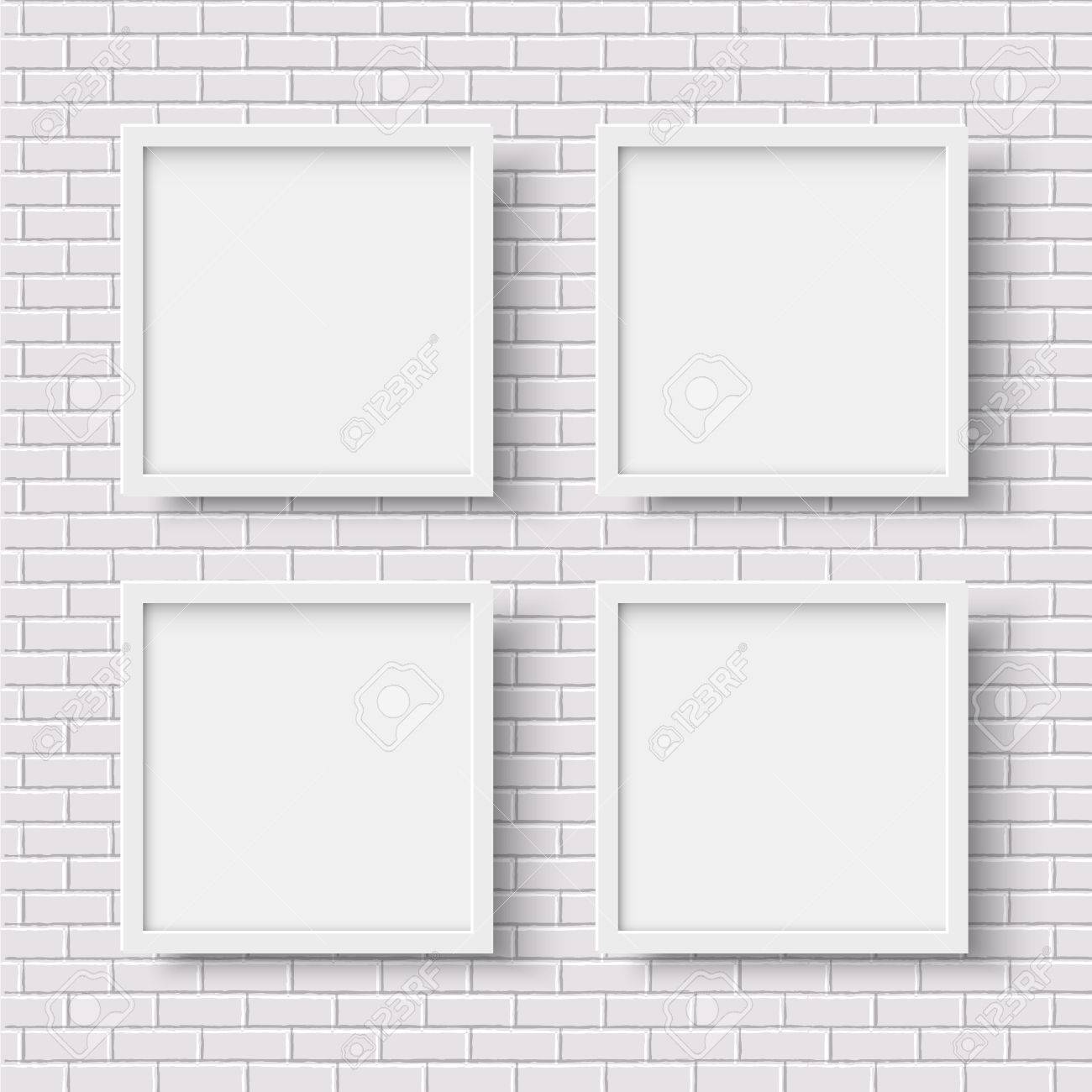 Four White Square Empty Frames On White Brick Wall Photoframe