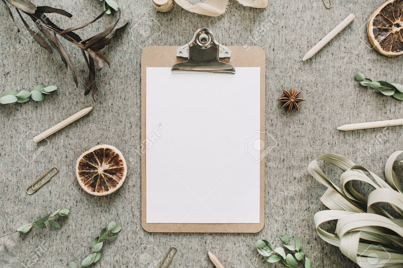 Mock Up Clipboard In Frame Of Dry Leaves And Oranges Eucalyptus