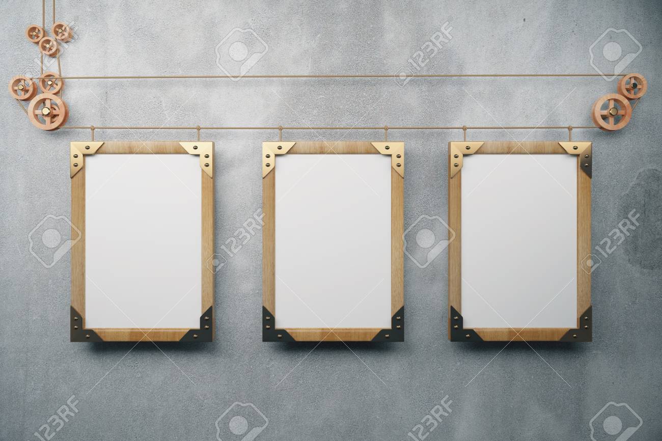 Blank Wooden Steampunk Picture Frames On Grey Concrete Wall