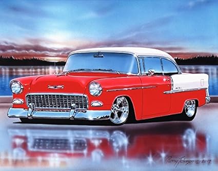 1955 Chevy Bel Air 2 Door Hardtop Hot Rod Car Art Print Red White 11x14 Poster