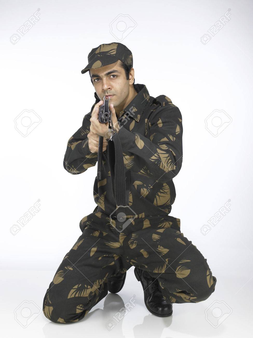 Indian Army Soldier Sitting On Knee Pointing Ak 47 Gun