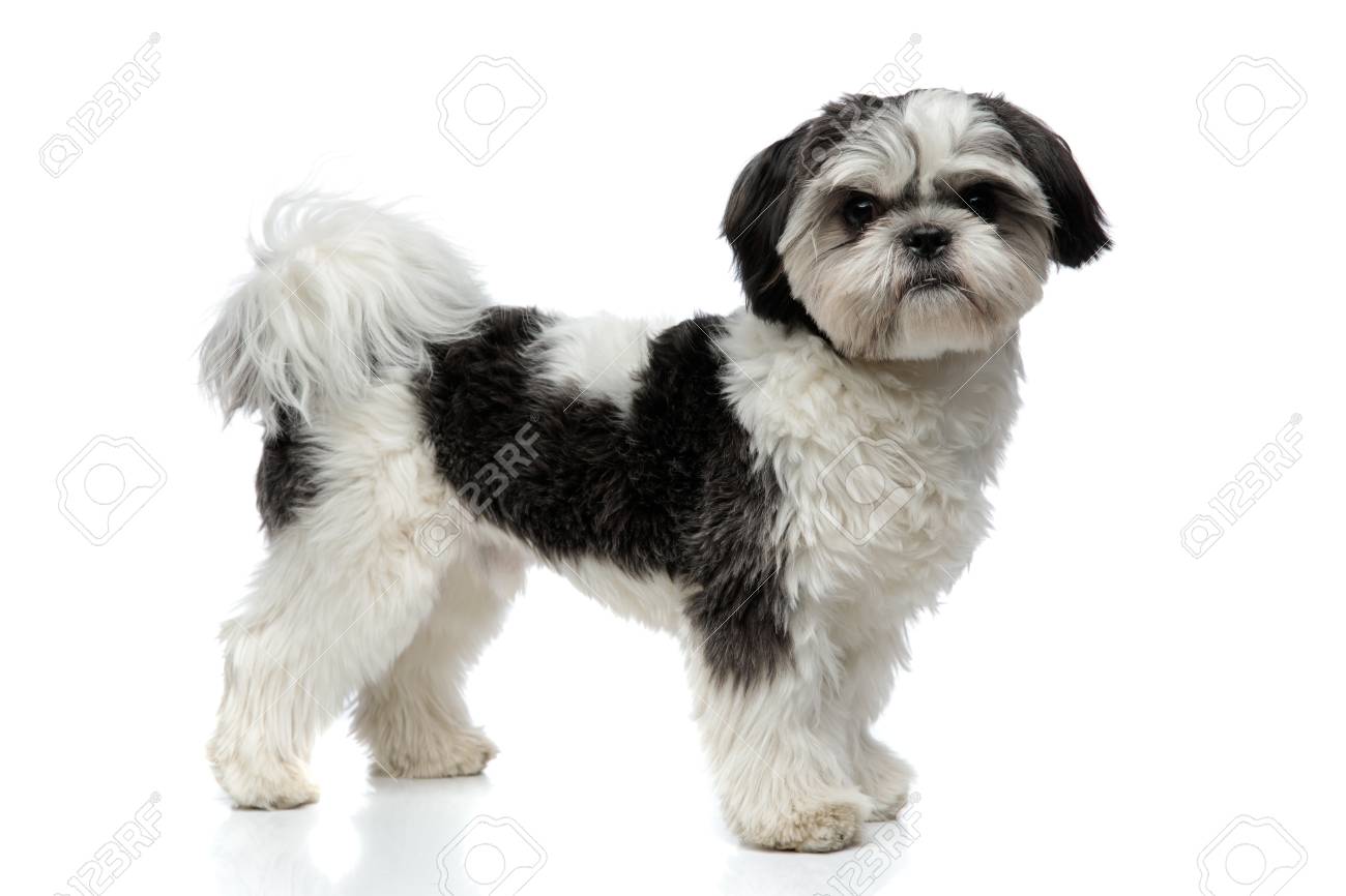 Side View Of Furry Black And White Shih Tzu Standing On White