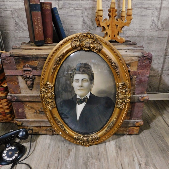 Details About Antique Oval Convex Bubble Glass Portrait Picture Handmade Wood Frame Woman